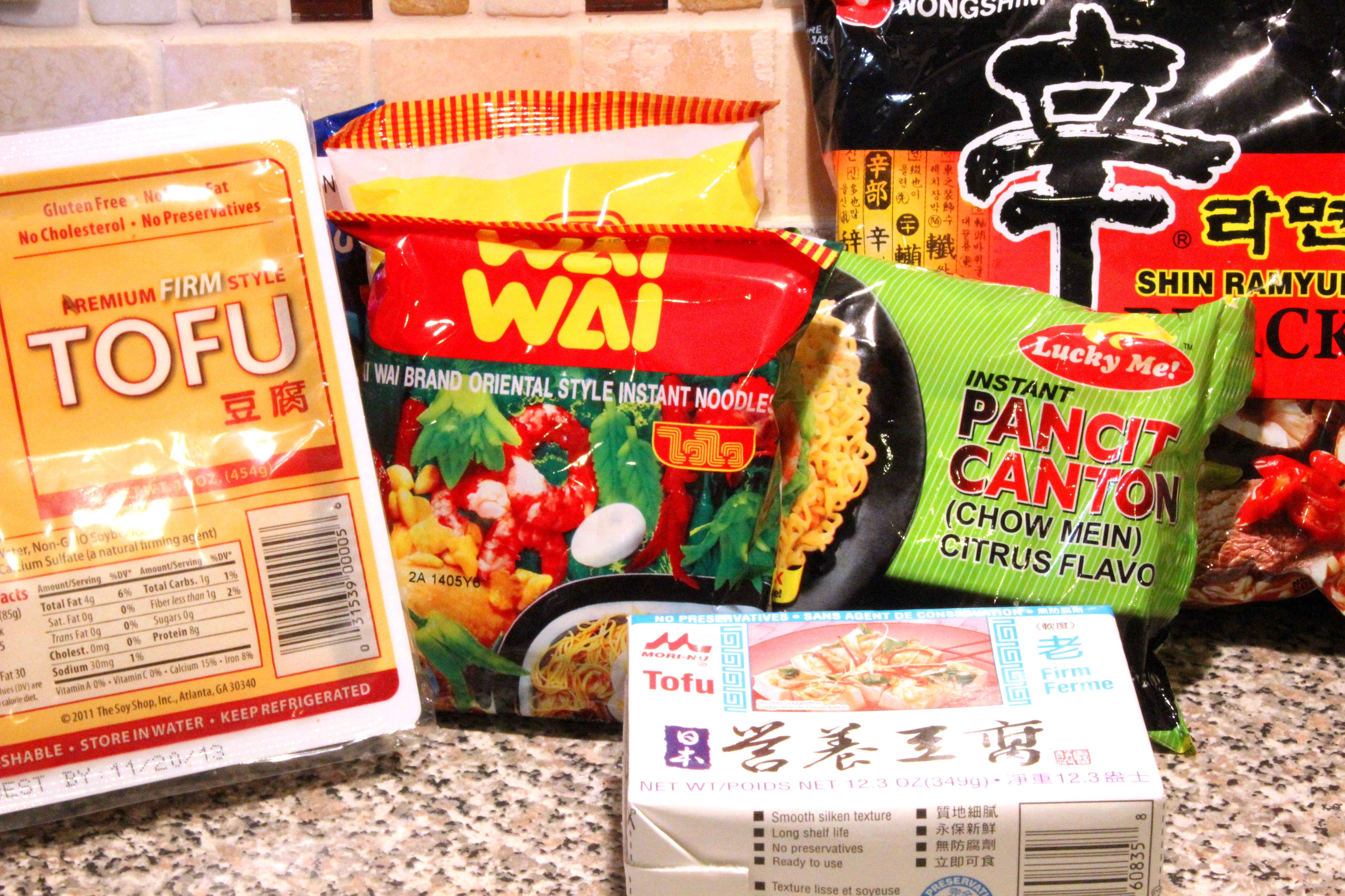 Ramen & tofu. It’s a complete meal. Well, minus the fresh veg (but you can get that at the market, too!) Check out the Asian/International market if for no other reason than to step outside the Maruchan paradigm. There are some damn tasty ramens out there–I recommend Nongshim (get the Shin Ramyun–so spicy) and the Mama brand. Toss in a knob of tofu and pretend as though you are being healthy.