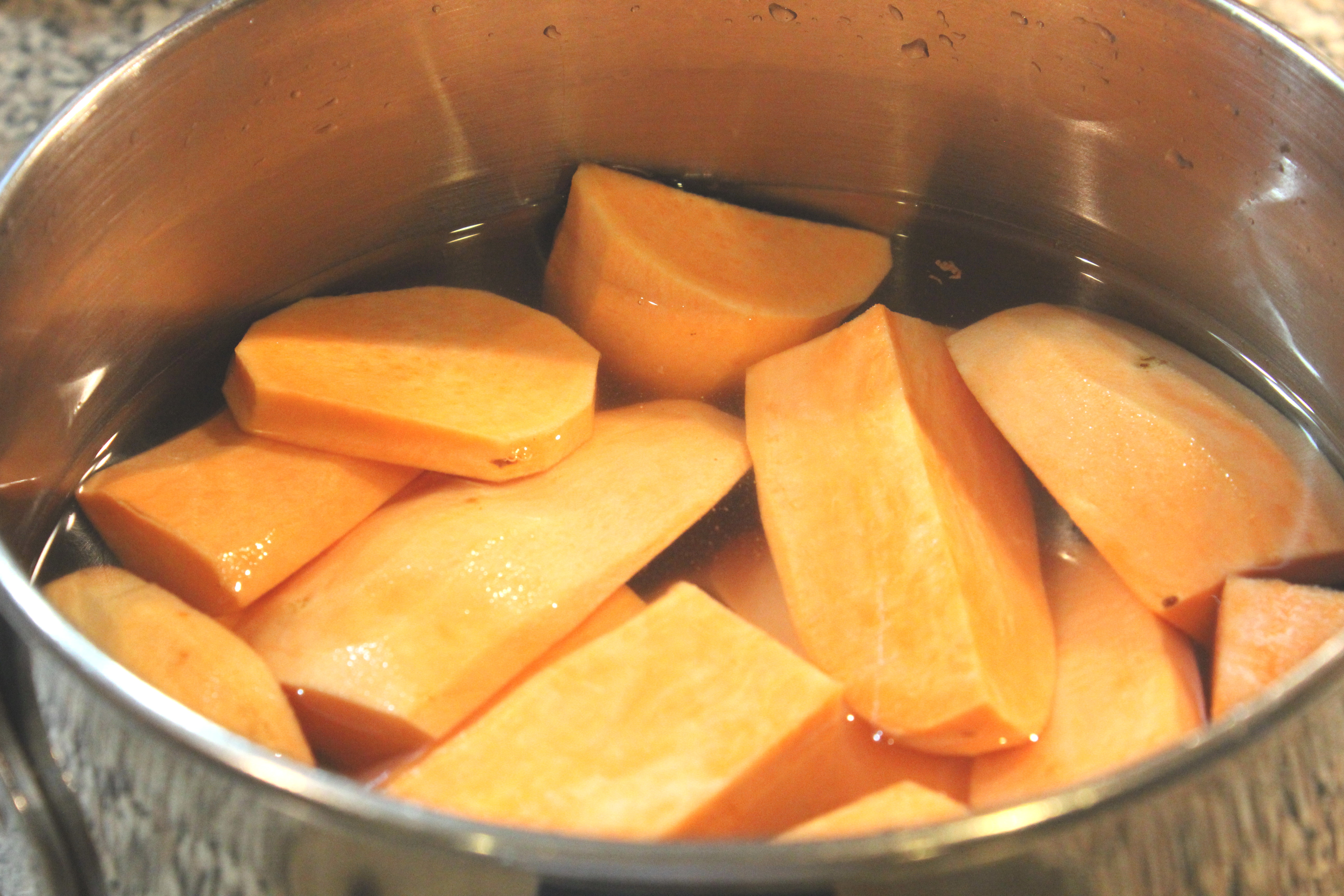 Take some sweet potatoes (I used three medium), peel them, quarter them, and put them in a medium pot and cover with water and a hefty pinch of salt (use veggie stock if you wish).