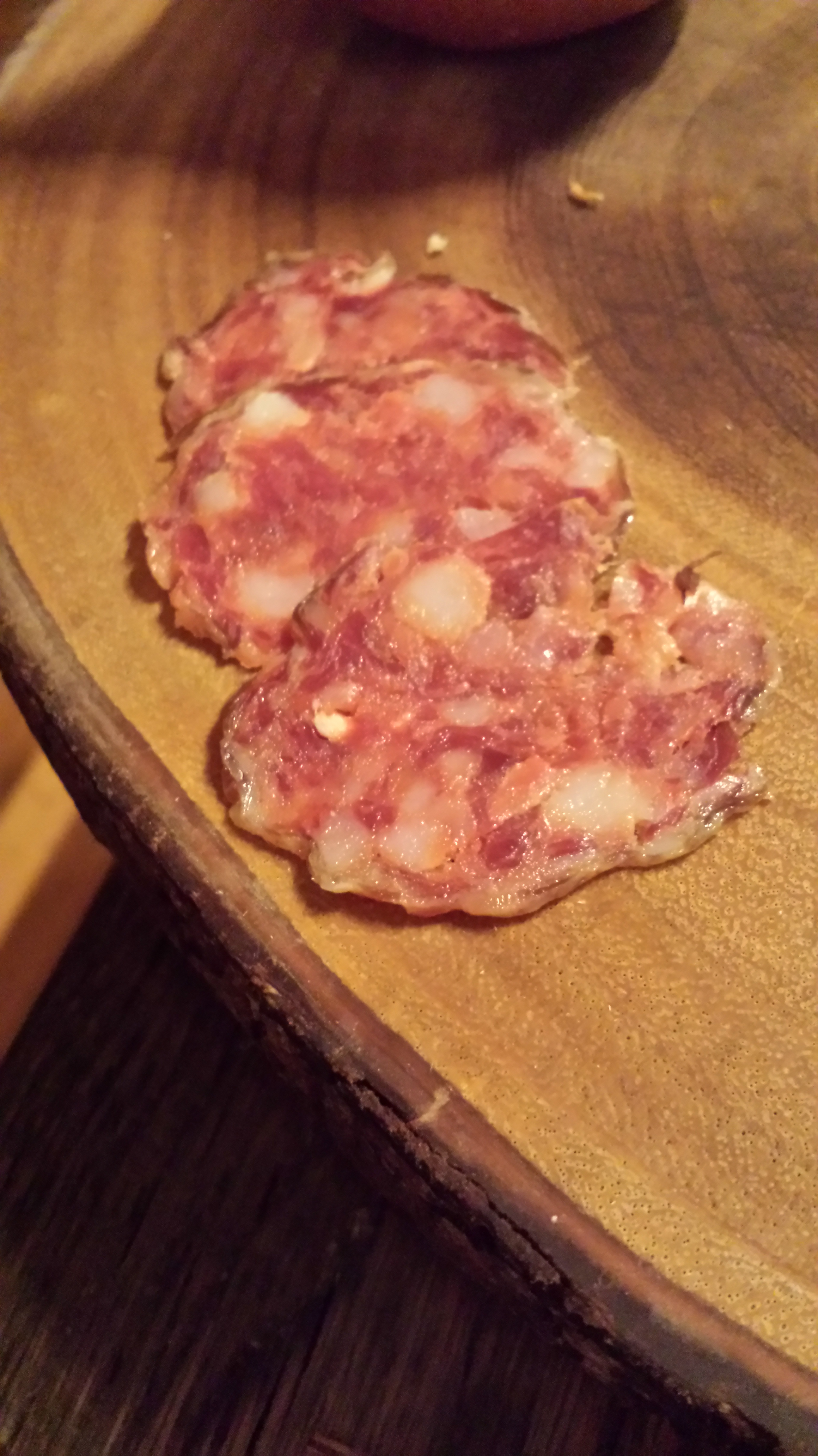 I kind of danced around the plate with my eyes. On the platter was some lamb sausage, aged ham, cured pork shoulder and beef tongue, some house pickles, house-made dijonnaise, fresh light rolls (HEY LOOK, SOMEONE SERVED CHARCUTERIE WITH BREAD OR CRACKERS, FANCY THAT ARNOLD MYINT, YOU WORTHLESS NO-TALENT REALITY TELEVISION TRASH!) Ahem. Anyway, holy mackerel, everything was a treat, and especially the tongue, which was so tender and flavorful. Melted in my mouth. And it was all served on a large slab o’ wood. Perfect.