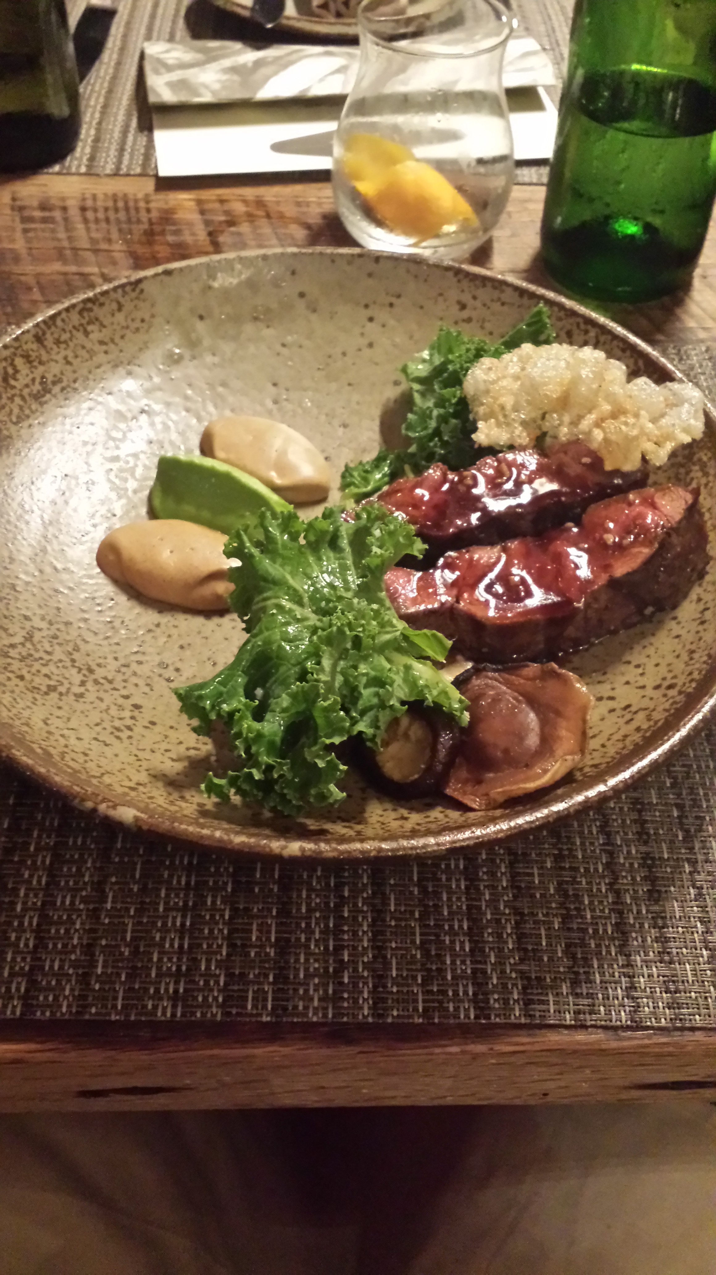 Those three blobs, at 10 and 11 o’clock. That was where they took brioche and pureed it, turning it into a kind of perfect meat condiment/pudding. It was everything I wanted it to be. And that thing up at 2-3 o’clock that looks like a pork crackling? It was a freeze-dried beef tendon they had turned into some sort of crackling-like material and dusted with something else that tasted amazing. Surprise. And I loved the pottery plates – they were beautiful.
