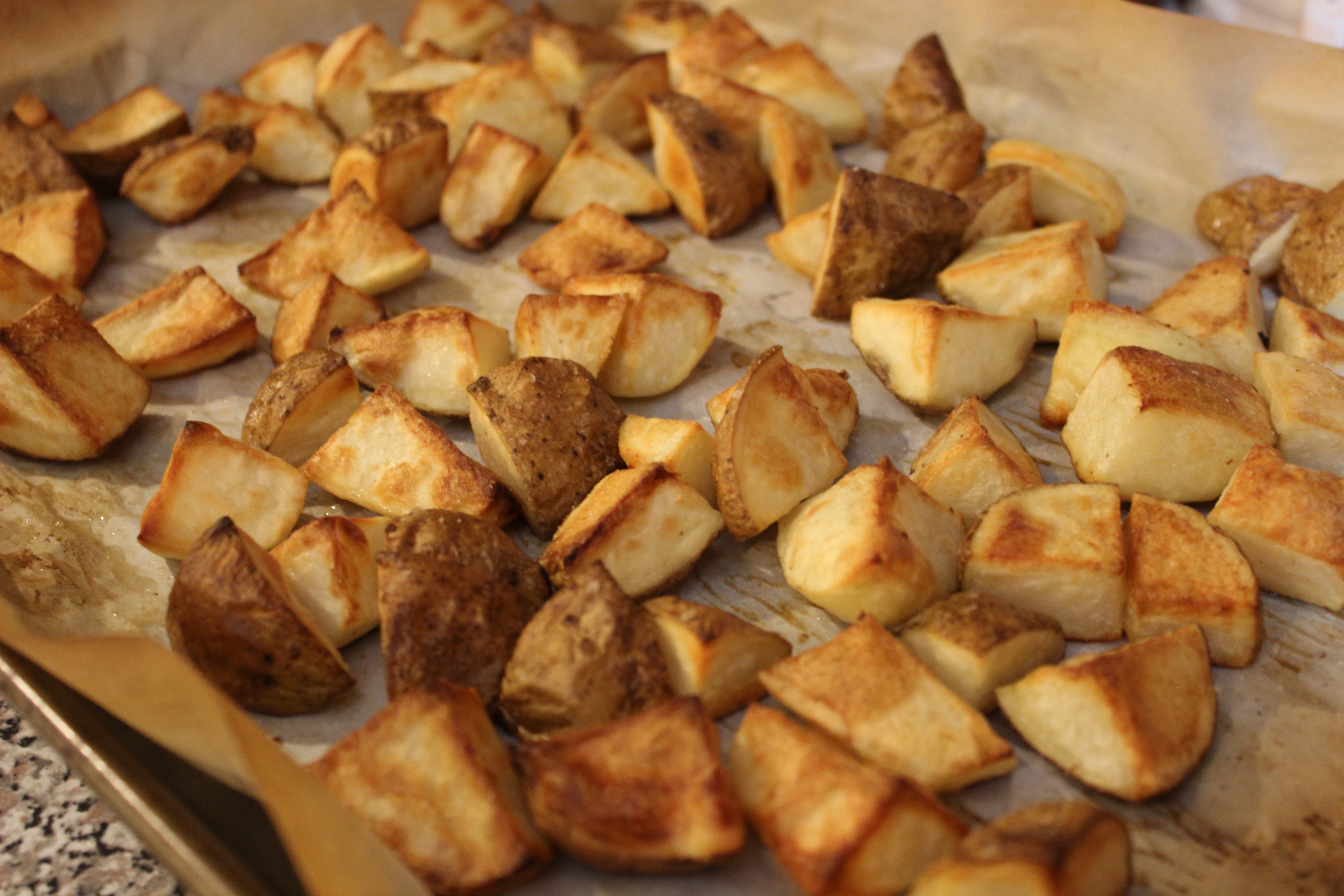 Preheat oven to 500°. Line a baking sheet (or two, if you are making a larger batch) with parchment for easy clean-up and no sticking. Toss the potatoes with the oil or fat (I do this right on the baking sheet) and add salt and pepper. Roast for 30-40 minutes, turning once. They are done when they are beautiful golden brown.