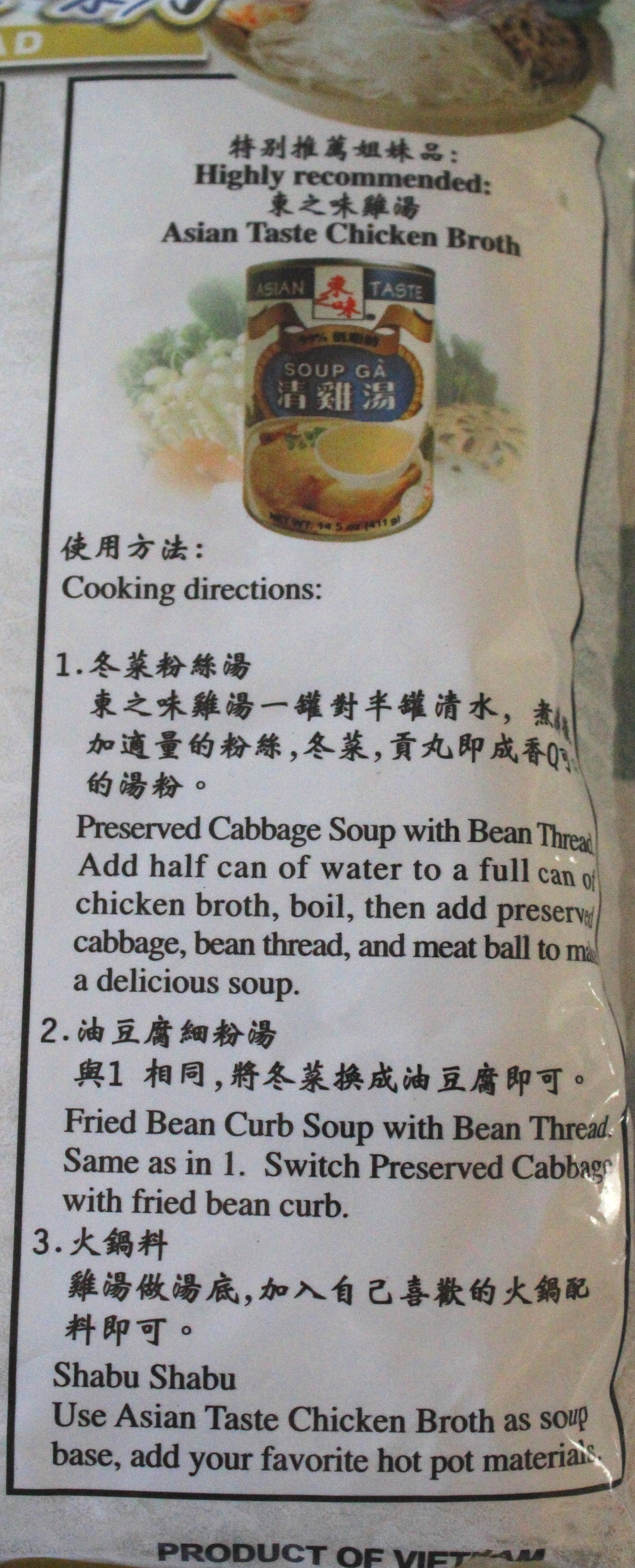 Some of the more common varieties are rice, bean (also known as cellophane or glass noodles), sweet potato, wheat, and buckwheat (the only acceptable use for buckwheat, IMO). Sadly, the instructions on the package often look like this: