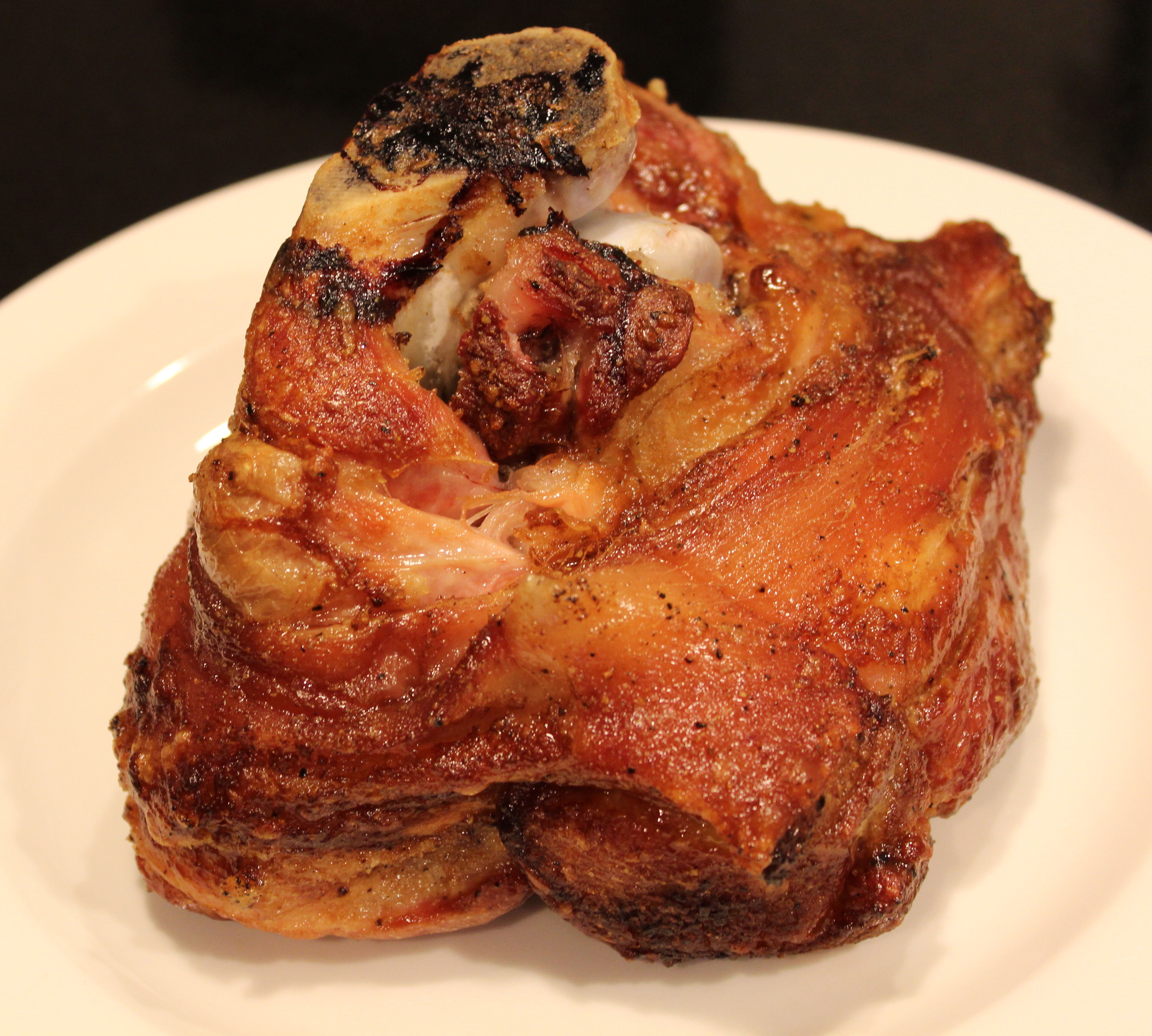 When I’m having a particularly tough day with the kids, I will often throw everyone in the Momvan and head to Sunrise. Immediately upon approaching the strip mall in which the magical shop is located, a sense of relaxation and giddiness set in. BitchyExasperatedMom swiftly transforms into EnthusiasticEXUBERANTmom. I am keenly aware that I should not fit in here, and yet? I absolutely do. The weekday butcher knows me and my penchant for all things fatty and strange. The owner has been known to bring her toddler grandson over to my preschooler to play together in the curry paste/fermented fish products aisle (I bought some belacan, and fully intend to make this one day.) One of the great things about Asian cooking is that it is really vegetarian friendly. I can purchase one pound tubs of fresh tofu (non-GMO) for $.99. I am fortunate to live in an area that has access to this product, and you will typically find two tubs of both their soft and firm tofu in my fridge. I keep tofu around for those nights when I forgot to soak the beans, didn’t take meat out of the freezer to defrost, or just want to reinforce my shamey ramen with some protein. But I’m not here to talk about vegetarian fare. On one of my more recent trips to the Asian market, I picked up a pork hock at the butcher counter. They looked really good, the weather was perfect, and I wanted to spin one around on my rotisserie. Get a rotisserie. You will have zero buyer’s remorse. I salted the hock and let it sit in the fridge, wrapped tightly in plastic wrap for about four hours. Then, I put it on the grill and did this.